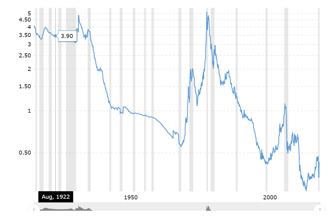 ドルの供給量に対しての金価格の比率のグラフになります。